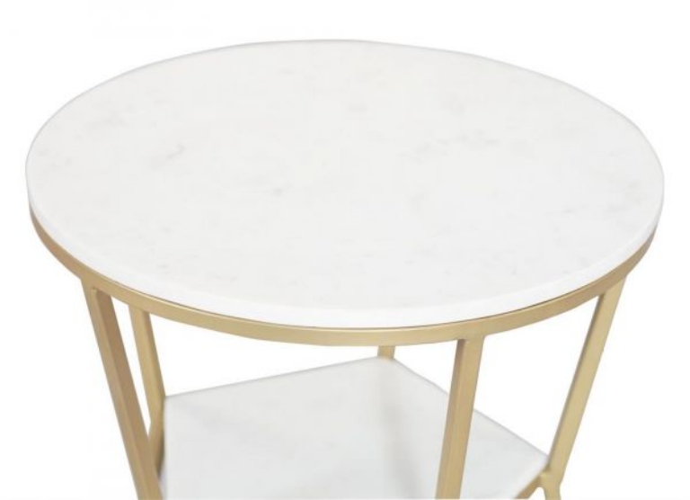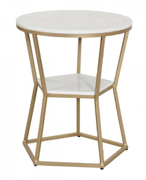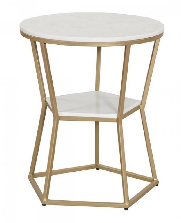 Form and function combine in a eye-catching fashion on this handsome Accent Table. The open metalwork frame has a distinctive hourglass shape and is coated in a rich golden hue, and beautifully supports a circular white marble top as well as a central hexagon shelf. Perfect for any room, any decor, and a wonderful way to display everything from a vase of fresh flowers to that new lamp and a couple of framed photos.