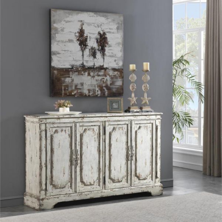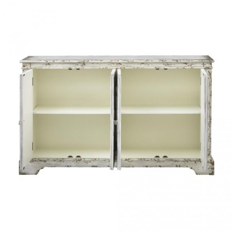 This Credenza finished in our Olivia Aged Cream is the perfect way to display your favorite vintage bread bowls as well as store those serving platters and linens! However, this piece is perfectly able to stand on its own in your den or family room, where the spacious shelved interior found behind the four front doors guarantees you plenty of room for your audio and video equipment, as well as a amply room for that new big screen on top!