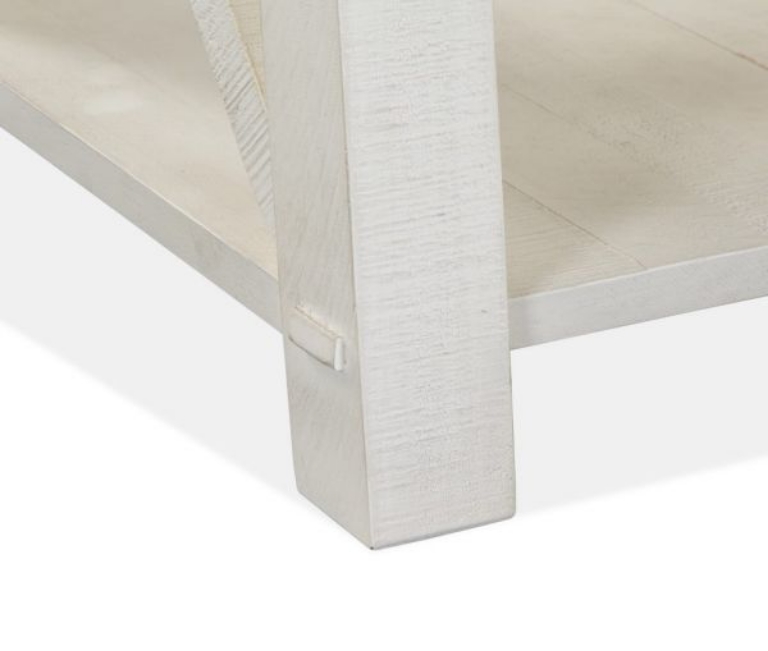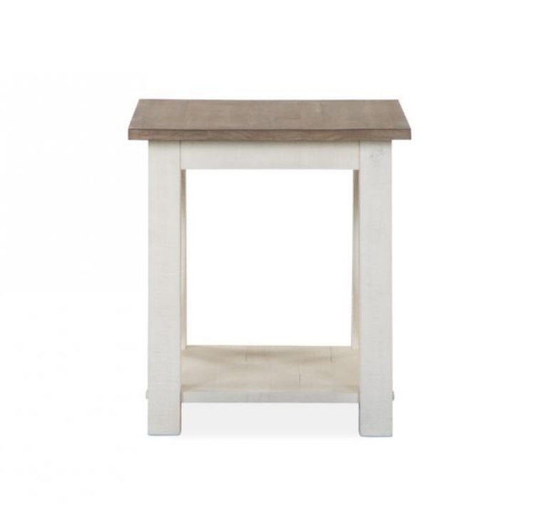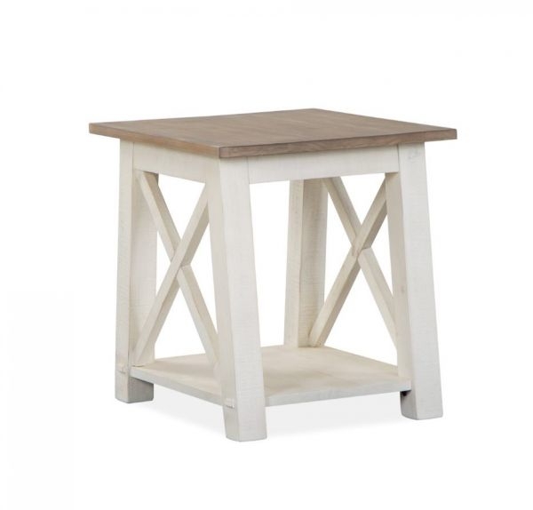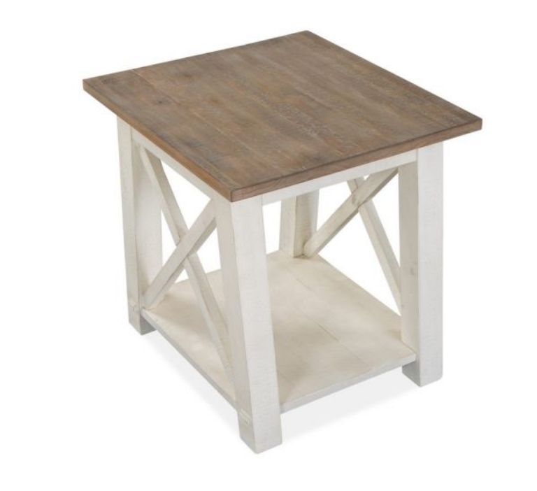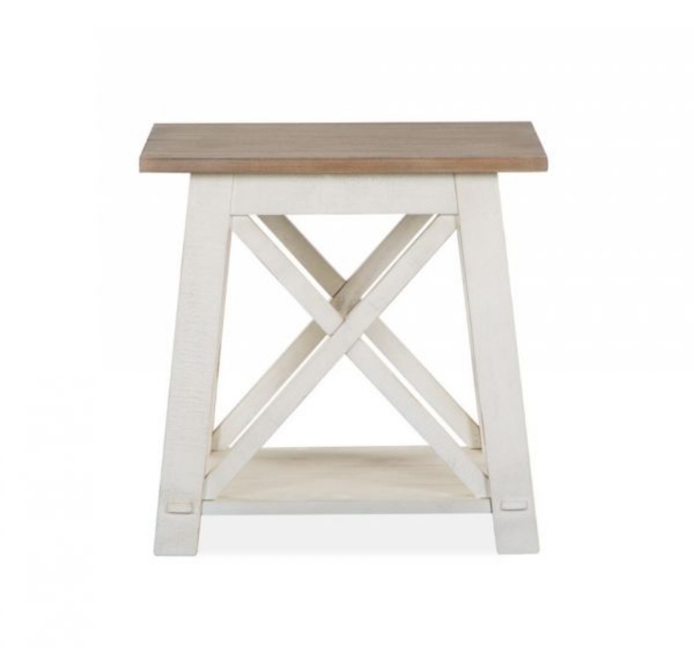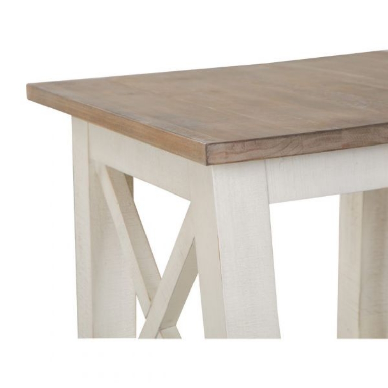 Add a touch of rustic farm house feel to your living space with the Sedley collection. This end table features a rustic pine high/low wood top, two "X" wood stretchers for support, and a fixed bottom wood shelf for storage.