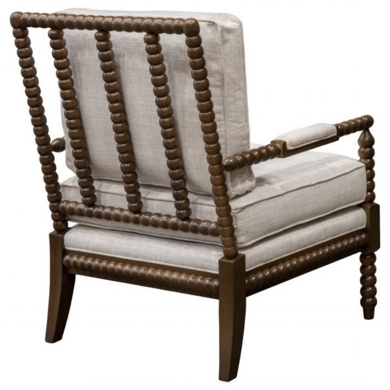 This classic carved wooden spool chair feels fresh and inviting. Featuring upholstered armrests, a contoured seat cushion, and a loose back pillow, this armchair offers comfortable livability with enduring style.