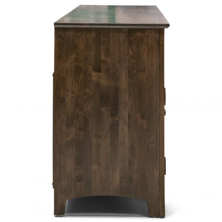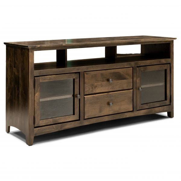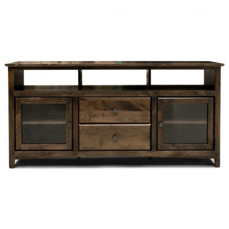The Springfield Console by Archbold Furniture. This 62" console is constructed from solid North American alder hardwood. Each drawer is made using English dovetail jointery for durability, and finished with full metal extension drawer guides. This model features two center drawers for storage, and two side compartments with glass doors and internal shelves. A middle compartment with rear wiring outlets is open for frequent access to electronic components. A selection of finish and hardware options are available in store.