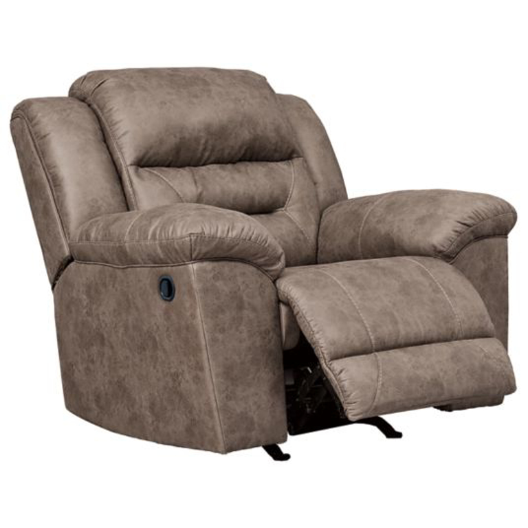 For those who love the cool look of leather but long for the warm feel of fabric, this rocker recliner easily delivers both. Its high-performance padded faux leather is remarkably durable and easy to clean, just for family spaces. Channel-stitched back cushions provide indulgent lumbar support for maximum comfort—not to mention fashion-forward flair.