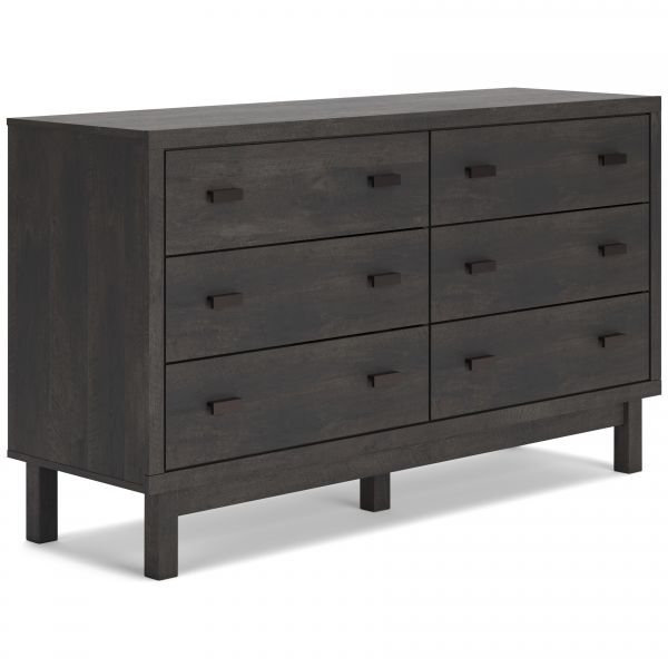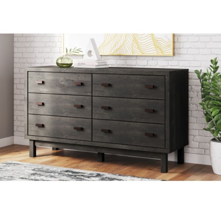 Rich in rustic yet contemporary character and decidedly simple on the details, this dresser maximizes the beauty of minimalism. Easy-on-the-eyes elements include a block base and a rustic charcoal finish that gives the wood grain aesthetic a highly modern feel. Easily stow your wardrobe, spare linens and throws in the spacious drawers.
