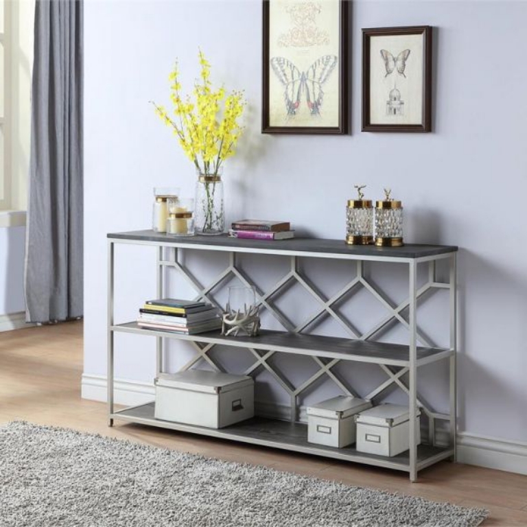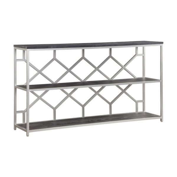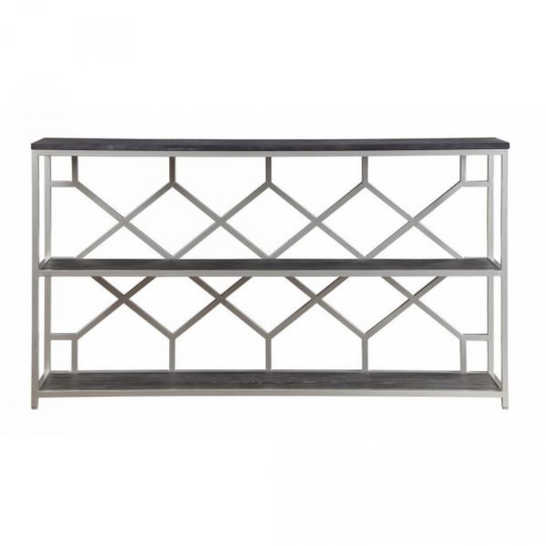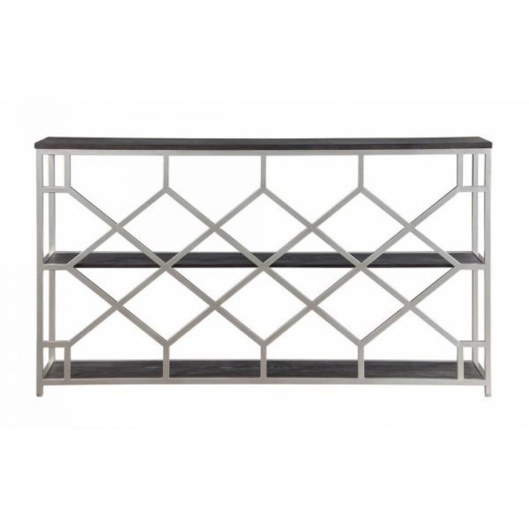 This stunning Console Table has been especially designed to be a showcase unit for any space, whether in your hallway, foyer, kitchen or den. Three long shelves finished in our Toro Dark Brown are perfect for everything from your cookbooks and vintage pottery, to baskets of books and games. The silvery metal linear frame adds just the right amount of stylish metallic, and has the added feature of a unique honeycomb design backdrop for that surprise burst of pattern.