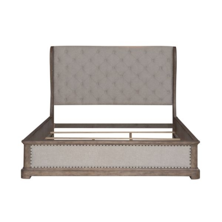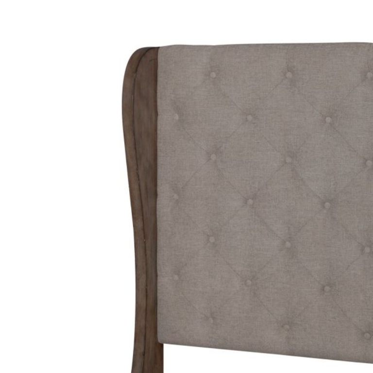 Turn your house into a home with the Town and Country queen shelter bed. Crafted with excellence using rubberwood solids and split heart oak veneers, this shelter bed features a Dusty Taupe finish. The wood framed shelter end panels on the headboard flow into a soft shape and encase the center panel, which features button tufted upholstery in a Cream Linen fabric. The softly rounded cap rail and pilasters on the footboard outline a beautiful upholstered panel in a Cream Linen fabric with a nail head trim. The Town and Country queen shelter bed is the essence of a timeless design. The traditional feel combined with the warm antique finishes create an effortless elegance.
