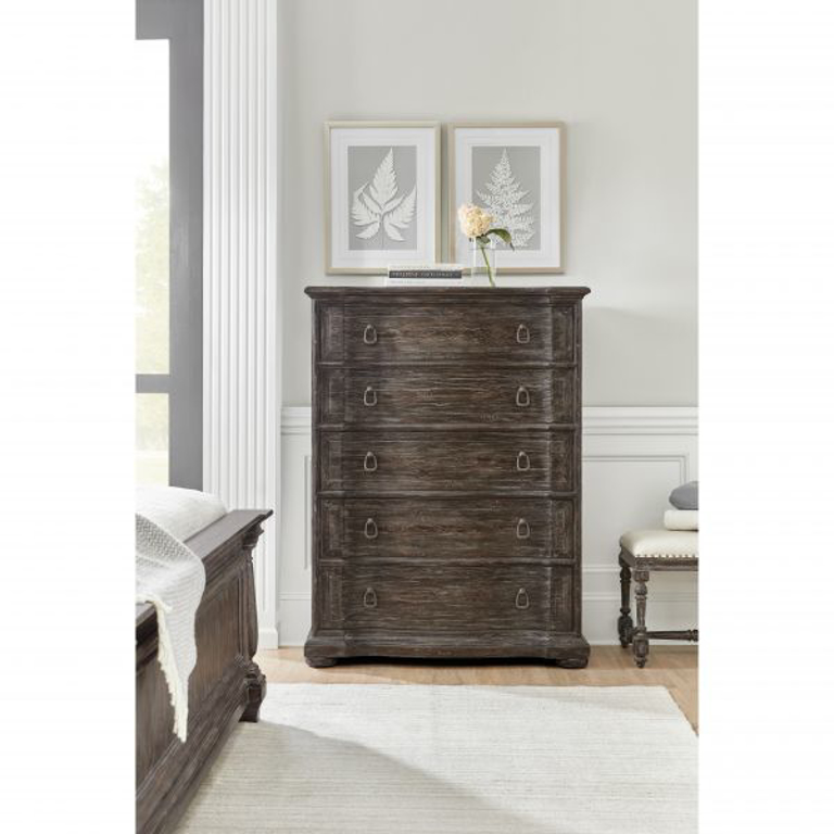 With a chic character, classic silhouette and rich brown Maduro finish with grey undertones, the Traditions Five-Drawer Chest sets an inviting tone for your bedroom retreat. Crafted of Pine Veneers with a Solid-Wood Edge top, the chest is loaded with function, featuring a top drawer with a removable felt liner, a cedar-lined bottom drawer, and all drawers have soft-close drawer guides. Teardrop hardware in an aged pewter finish and chic bun feet add a stylish touch. Inspired by a two-week trip through Europe in search of architecture and antiques full of vintage character, Hooker Furniture introduces the Traditions Collection. Targeting a design-oriented consumer with a sophisticated style, the whole home collection – one of the largest in company history – uses familiar forms to present a nostalgic, yet comfortable aesthetic. Layered with fresh elements, the group offers an updated presentation that speaks to a storied past, yet easily transitions into today’s interiors.