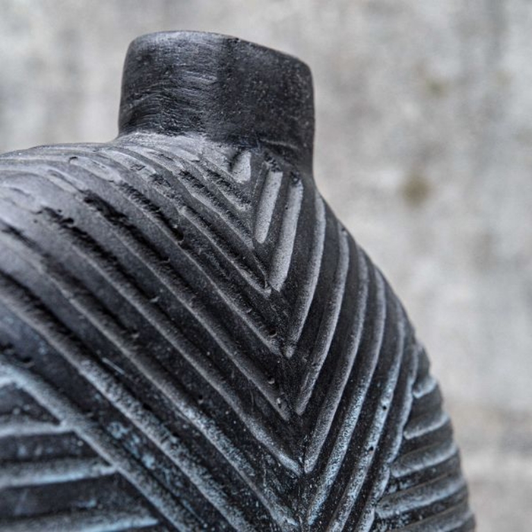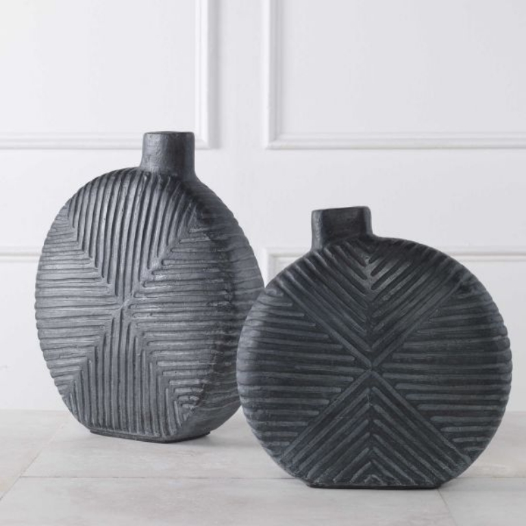This set of vases is accented by contemporary geometric carving in aged black with off-centered openings, perfect for floral stems or placed among your other favorite accessories.