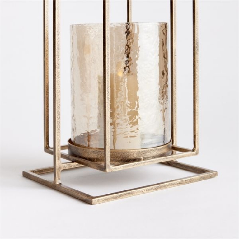 With a warm antique gold finish, elevated design and hammered lustre glass hurricanes, this candleholder is a work of art. Perfect for side table, entryway console or mantel.