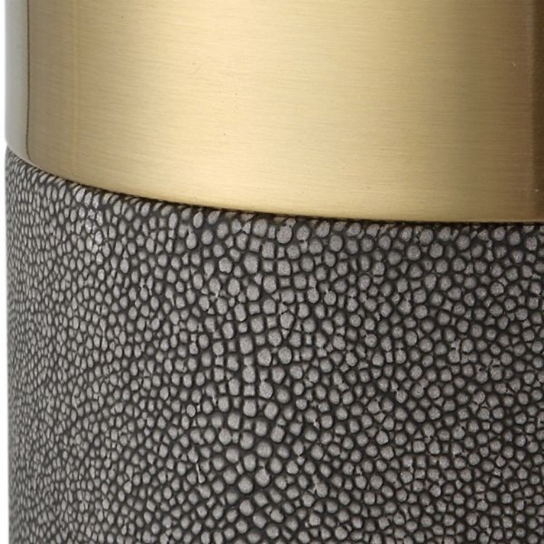 The Wessex Candleholders are covered in a gray faux shagreen with iron candle cups finished in antique brushed brass.
