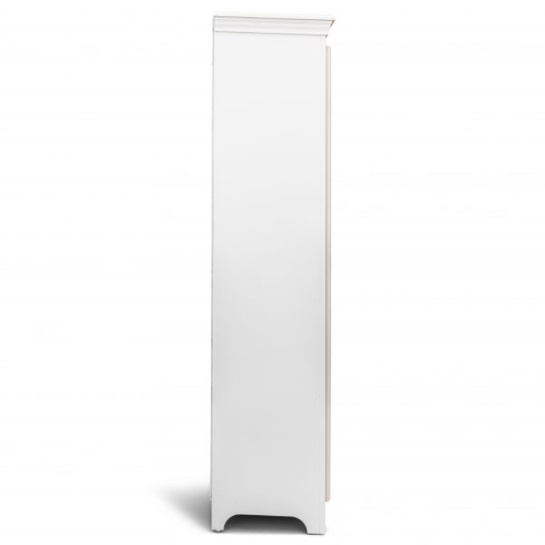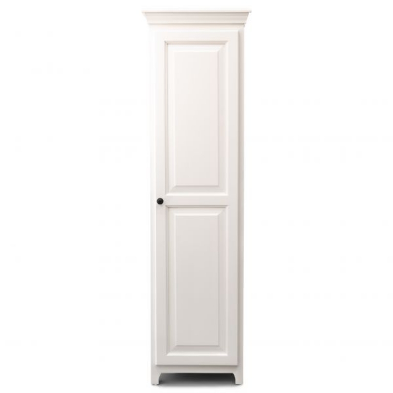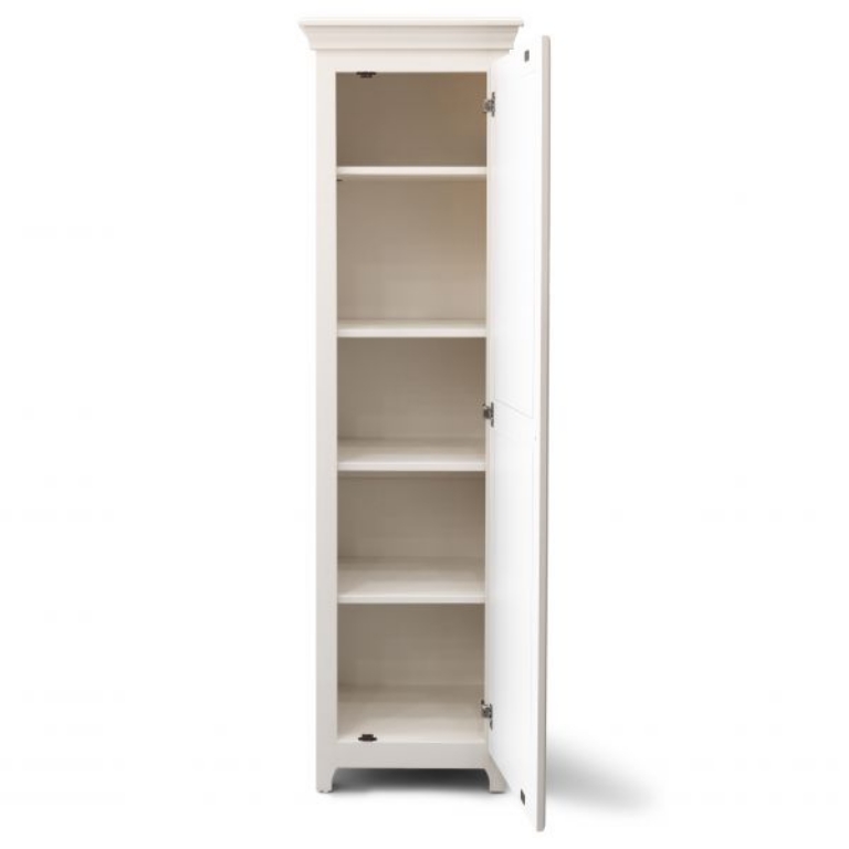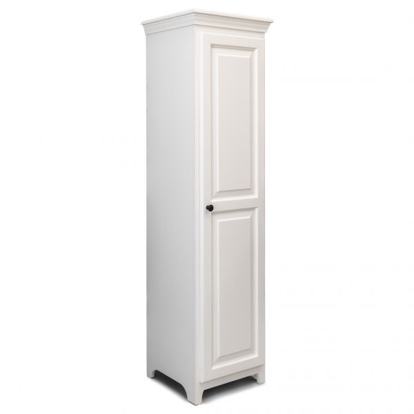 This pine, one door cabinet can be used in your kitchen or bath area for extra storage space. The piece is made here in America using solid wood construction. Inside are four adjustable shelves that enable you to organize your items for maximum storage capacity. Finally, the raised, and removable, panel door offers increased functionality while adding style to your space as well. Shown in store with Linen White finish.